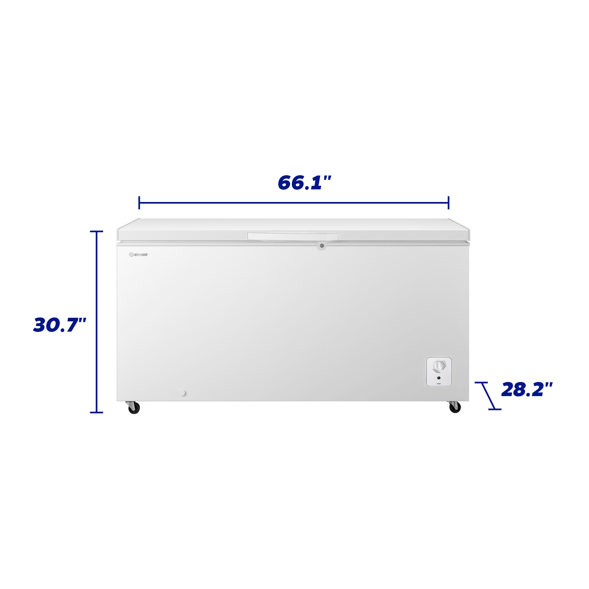 Element’s 17.7 cu. ft. Chest Freezer gives you more space for all of your frozen favorites. It’s perfect for your basement, kitchen, utility room, or even man cave — wherever you need easy access to your favorite frozen foods. This deep freezer comes with two storage baskets to keep you organized. Small items can be separated from large, bulky items for quick access (and so they don’t get lost at the bottom). You can even remove the baskets if they don’t fit your storage needs. It can also be converted from a freezer to a refrigerator with the simple turn of an external dial – no need to open the lid. Element’s 17.7 cu. ft. chest freezer can also be converted from a freezer to a refrigerator with the simple turn of an external dial – no need to open the lid. The classic white powder coating finish and external handle create a streamlined look that’s perfect for any space. Plus, it features a lock to keep foods perfectly frozen and prevent unauthorized access. Buy meat in bulk, store extra frozen pizzas, or take advantage of unbeatable deals. Whatever your needs, maximize your freezer space with this chest freezer. Bring it home.