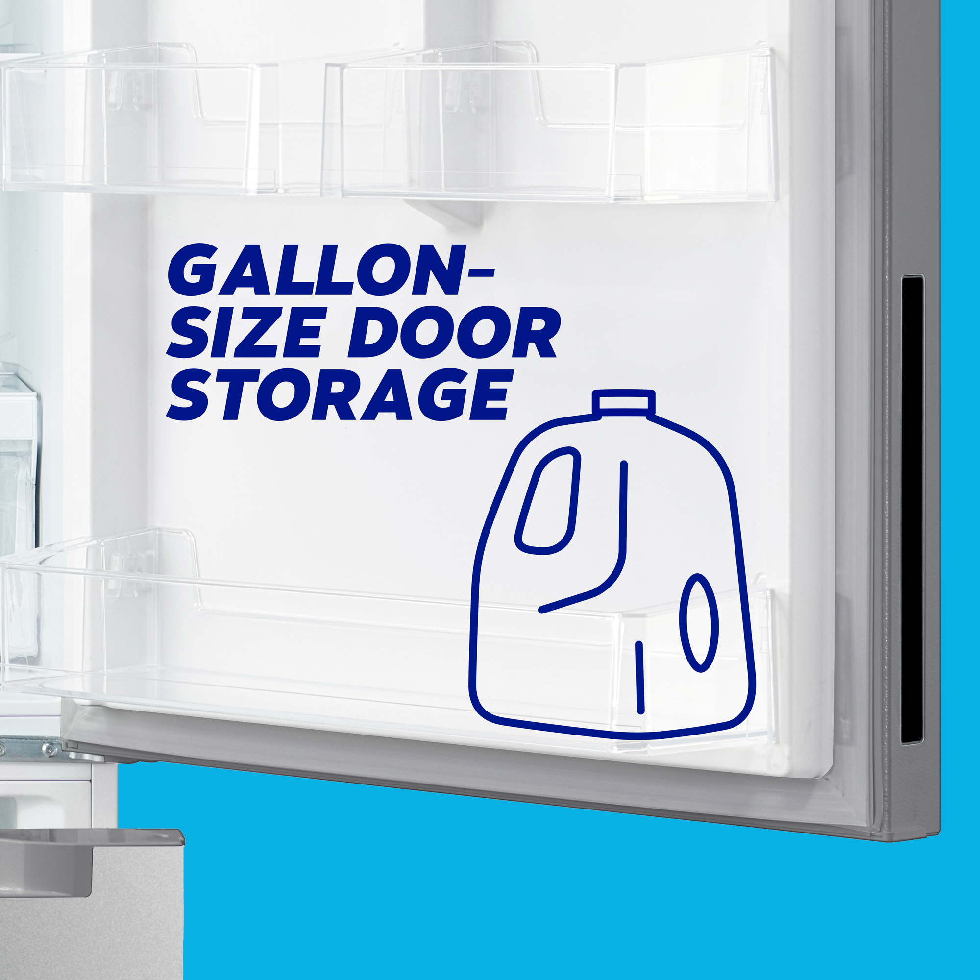 - GALLON-SIZE DOOR STORAGE - The fridge door has even more flexible storage space. Keep large containers within reach — and out of the way — in the gallon-size door bins. Save valuable shelf space with convenient storage options. Plus, removable door storage makes cleaning up messes a breeze.