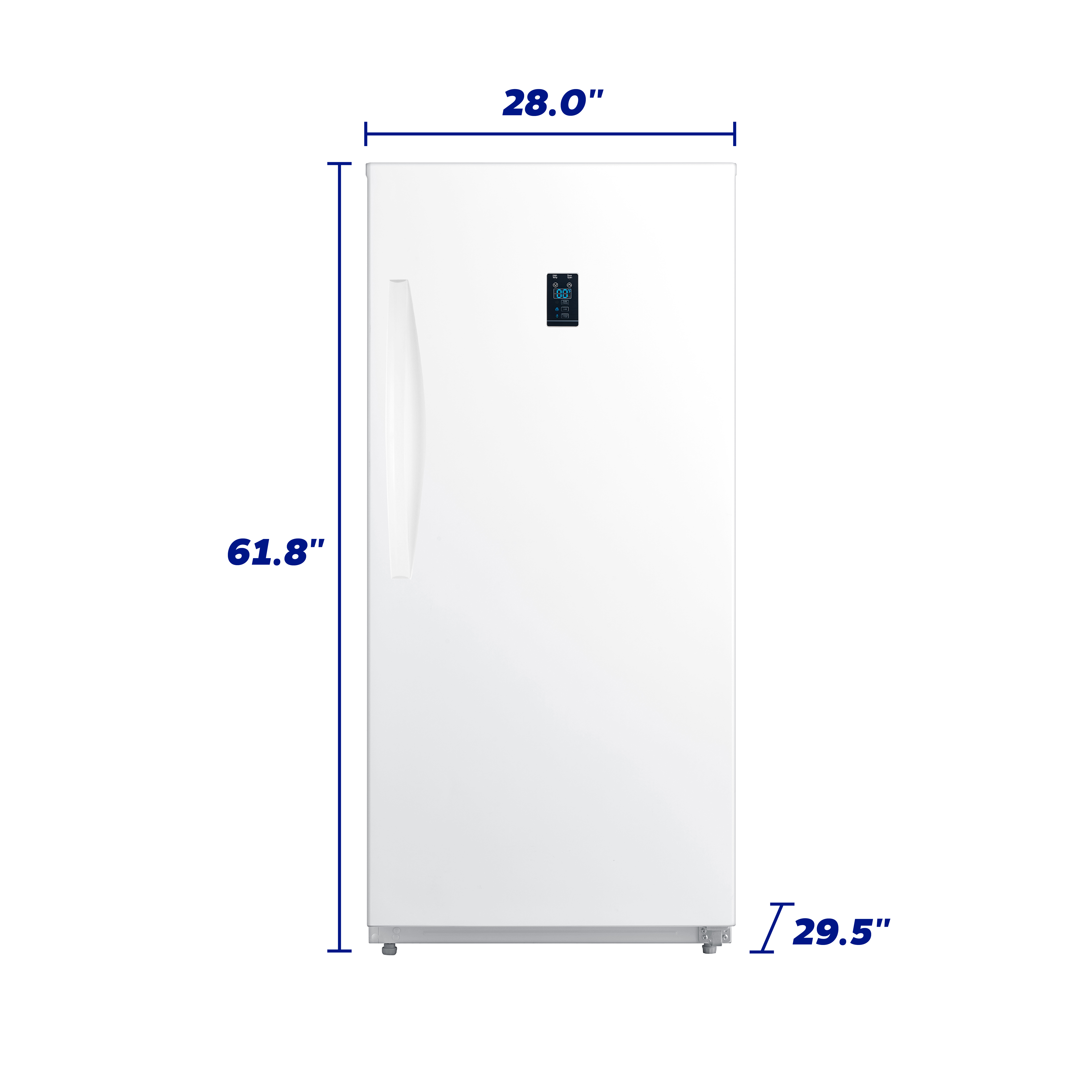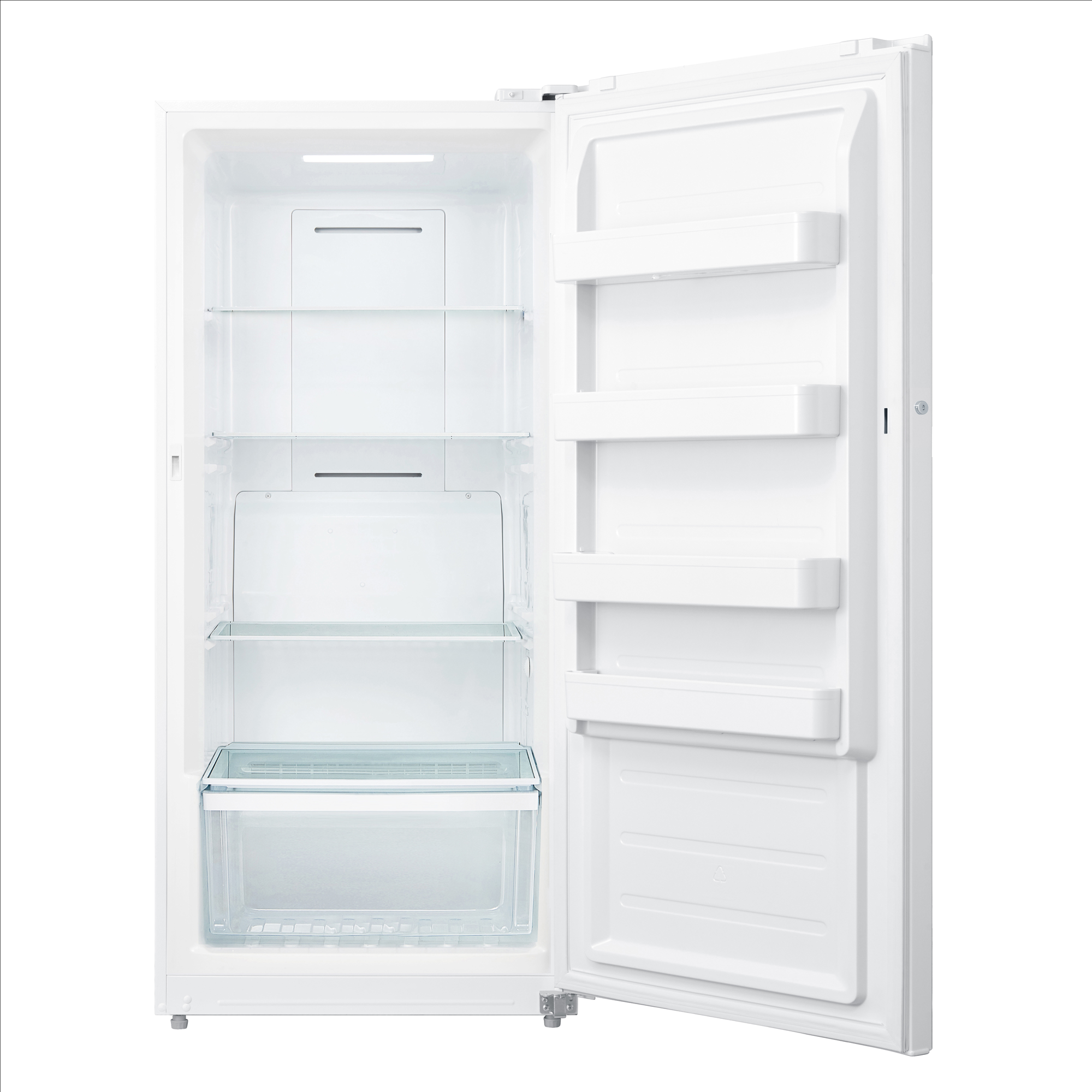 Element's 13.8 cu. ft. Upright Freezer gives you more space for all of your frozen favorites. It’s perfect for your garage, basement, kitchen, utility room, or even man cave — wherever you need easy access to your favorite frozen foods. With four adjustable shelves, you can customize its storage space to fit large or small containers easily. The shelves are spill proof, making it quick and easy to clean up spilled messes. It can be converted from a freezer to a refrigerator with a simple electronic control. Plus, it's garage ready, making it perfect for storing popsicles in the summer.The logo-less exterior and white finish on Element’s 13.8 cu. ft. upright freezer allow it to match any space seamlessly. It features an interior light for grabbing a late-night snack. Element’s upright freezer uses a no-frost system, so your food never frosts over. This reduces the chance for odors and freezer burn that can affect the taste of your food. Its high temperature and open-door alarms also reduce the chance for wasted food. It comes ENERGY STAR® certified to keep your electricity bills down. Plus, it features a lock to keep foods perfectly frozen and prevent unauthorized access.