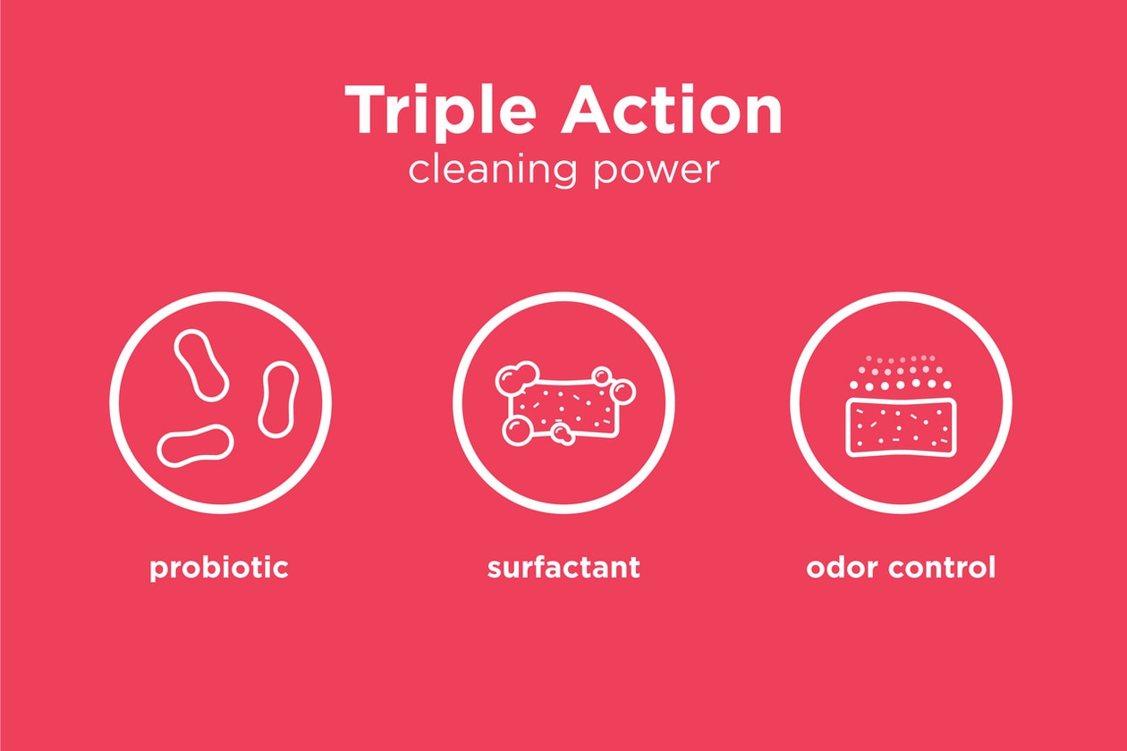 - Cleaner features triple action cleaning power with probiotic, surfactants and odor control that effectively reduces odors, and removes residue and buildup.