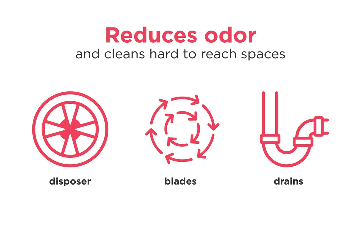 - Reduces odor caused by food remnants and buildup found deep in drains and while also cleaning the disposer sidewalls, blades, splash guard and other spaces throughout the disposer.