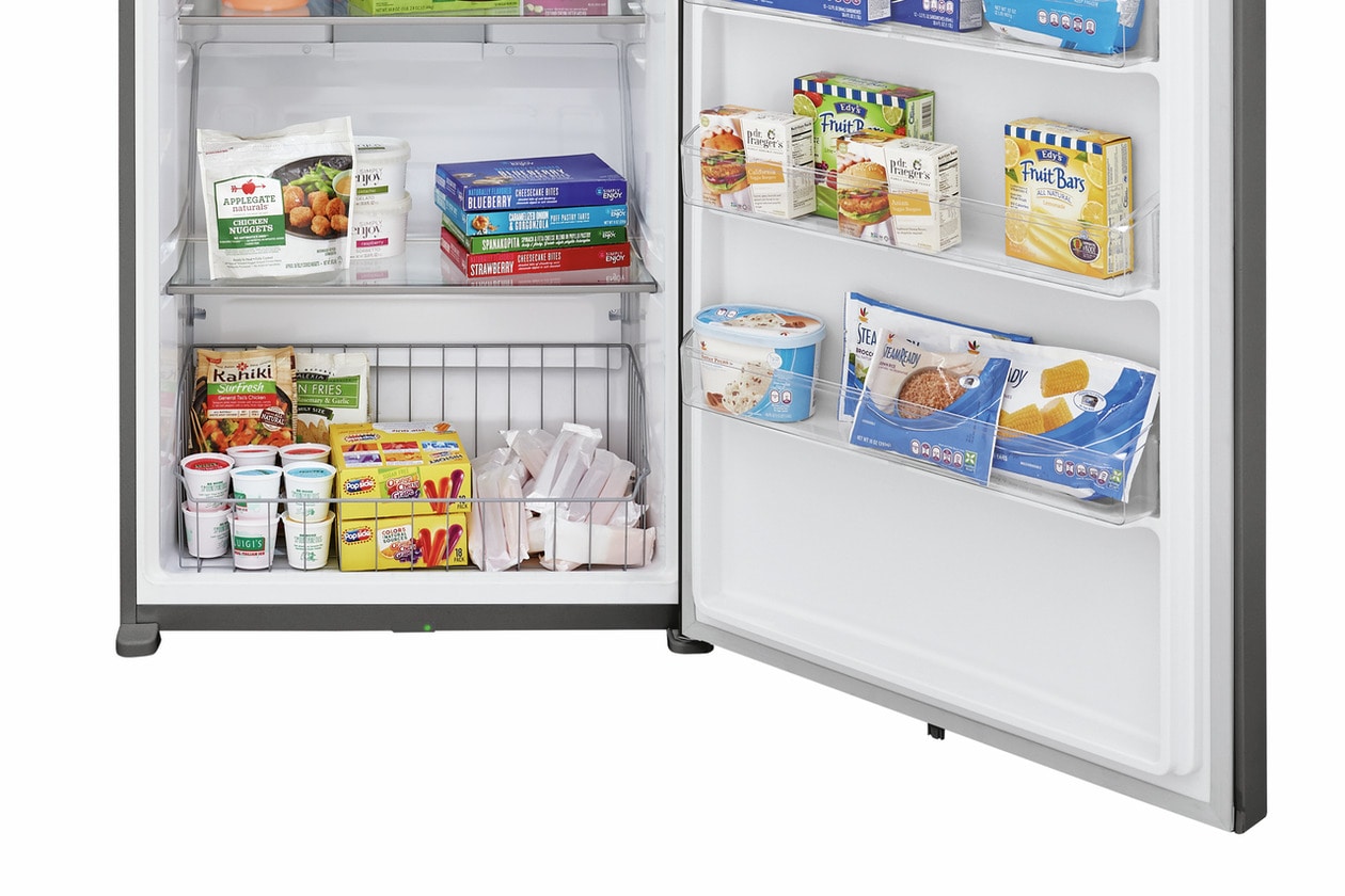 This Frigidaire 20 cubic foot upright freezer includes a superior tight seal that locks in cold air, keeping food frozen for two days if there is a power outage, and the EvenTemp™ Cooling System, with a variable speed compressor that constantly circulates cold air throughout the freezer with smart sensing technology that adjusts air flow to maintain a uniform temperature. The flexible interior organization system enables you to easily organize your family's frozen favorites with four adjustable, full-width glass shelves, deep bottom basket, and five spacious door bins.