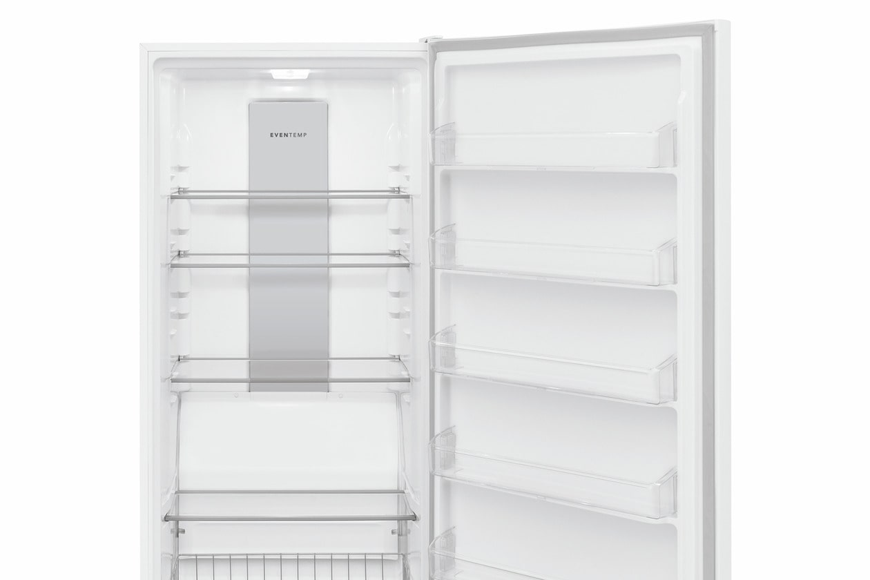 This Frigidaire 20 cubic foot upright refrigerator prevents warm spots and unwanted freezing and ensures a consistent temperature throughout with the EvenTemp™ cooling system. The flexible interior organization system enables you to easily organize your family's favorite foods with four adjustable, full-width glass shelves, deep bottom basket, and five spacious door bins. Additionally, enjoy the ability to maintain the ideal environment for your refrigerated foods with our audible temperature alarm that alerts you if the door is left open or the refrigerator's temperature rises, and auto-close doors, which ensure that your refrigerator is never left slightly open by mistake.