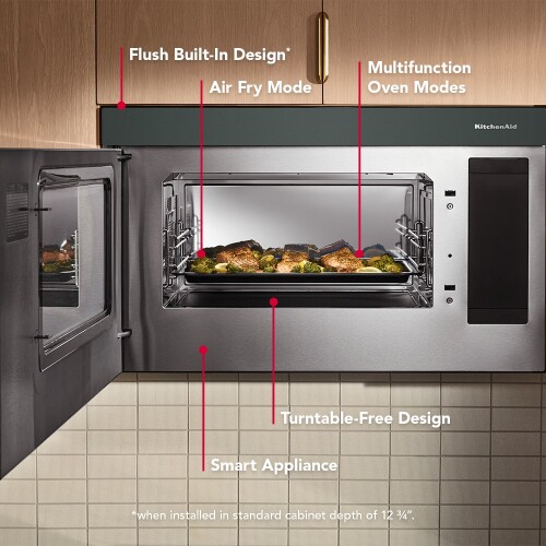 Free the countertop. This KitchenAid® Multifunction Over-the-Range Microwave Oven combines the versatility of an air fryer, toaster oven, convection oven, microwave and ventilation hood, all in one space-saving appliance designed for flush installation within a standard 12 ¾" cutout.