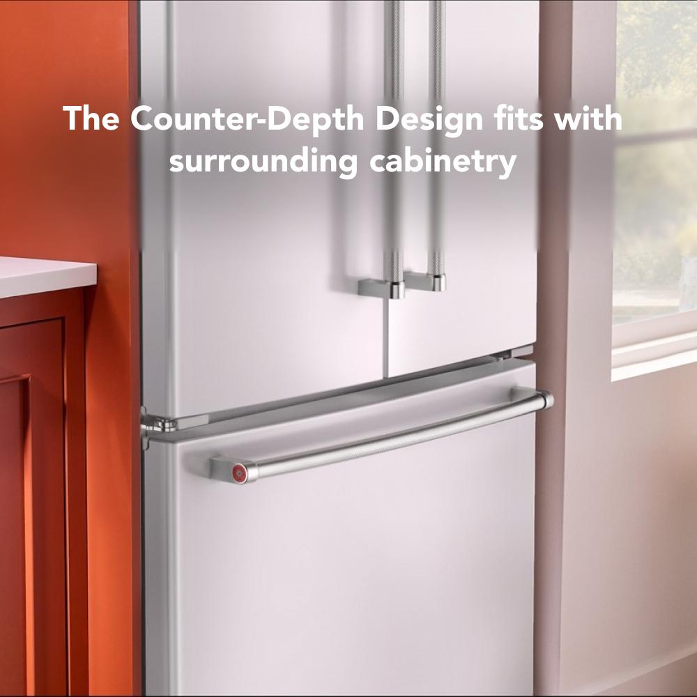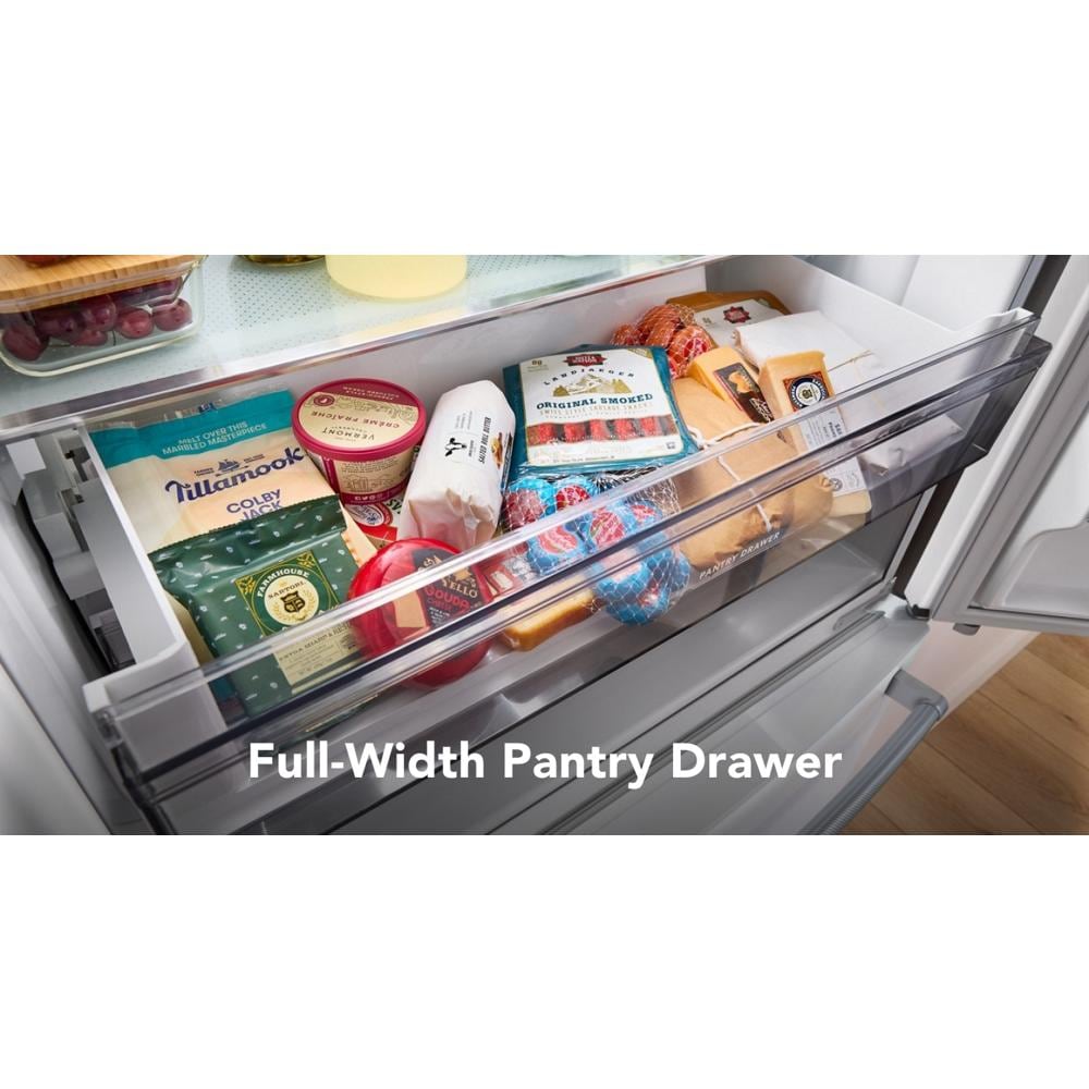 Enjoy freshness within reach. This KitchenAid® counter-depth french door refrigerator features an interior water dispenser to keep the outside looking sleek. Get customizable storage with an adjustable wood-look nesting shelf and convenient space for wide items with a full-width pantry drawer. And the counter-depth design allows the refrigerator to fit nearly flush with surrounding cabinetry, offering a built-in look and more room to move in your kitchen.