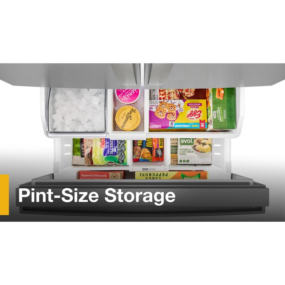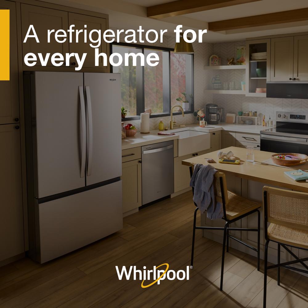 Get Family-Sized capacity with the Whirlpool® 31 cu. ft. French door refrigerator. Large Capacity Ice Production makes over 3 lbs of ice every day. Pint Size storage provides easy access to small items. And flexible storage with half and full Adjustable Glass Shelves.