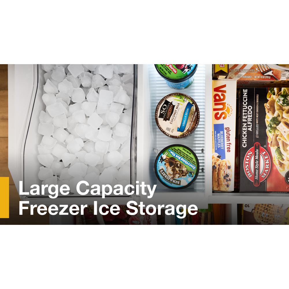 - Large Capacity Freezer Ice stores over 7 lbs of ice with built-in ice maker in freezer. Use it to fill the cooler, or turn it off for additional frozen storage space.